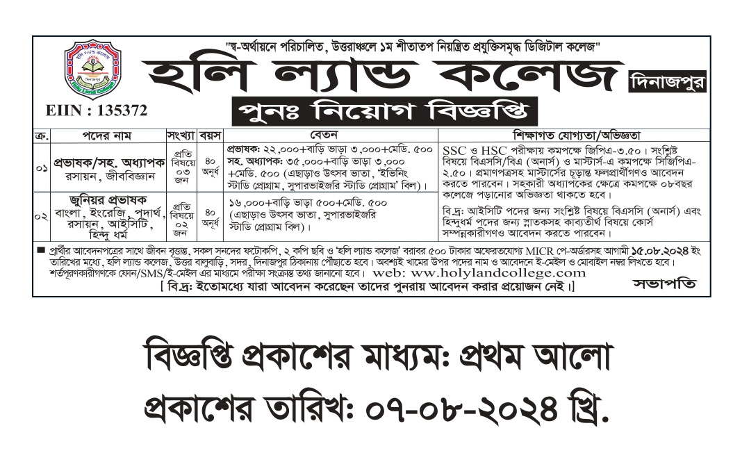 নিয়োগ বিজ্ঞপ্তি ১৫.০৭.২০২৪ খ্রি.