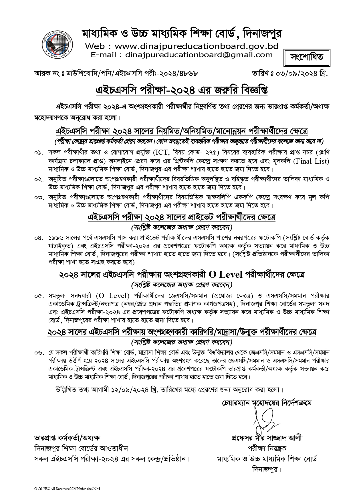 ২০২৪ সালের এসএসসি পরীক্ষার ফলাফল প্রকাশ সংক্রান্ত (০৫-০৯-২৪ইং)