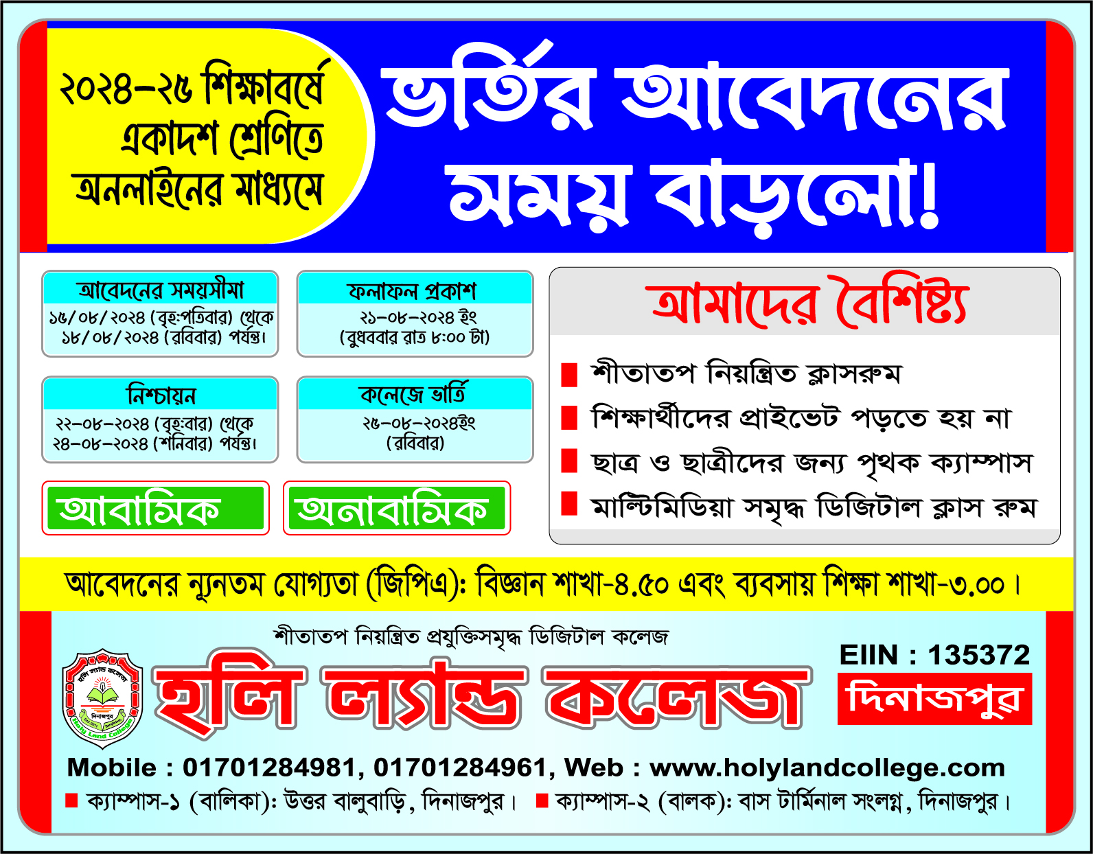 ২০২৪ সালে হলি ল্যান্ড কলেজ-এ একাদশ শ্রেণিতে বিজ্ঞান ও ব্যবসায় শিক্ষা শাখায় ছাত্র-ছাত্রী ভর্তি কার্যক্রম চলছে । অনলাইনের মাধ্যমে আবেদনের ন্যূনতম যোগ্যতা: বিজ্ঞান শাখায় জিপিএ ৪:৫০ এবং ব্যবসায় শিক্ষা শাখায় জিপিএ ৩:০০।